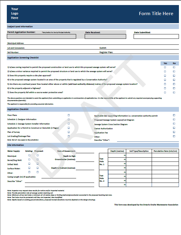 When applying for an Ontario Building Code (OBC) sewage system permit, the OBC prescribed application forms satisfy regulatory requirements, but they do not capture the detailed technical information required to properly document and review a proposed sewage system. To address this gap, sewage system regulators across the province have developed their own methods for collecting additional information ranging from simple checklists to multi-page prescriptive forms. This has resulted in significant inconsistency in the application process from one jurisdiction to another, a challenge that many of our members have identified through their feedback. One of the Association’s roles is to listen to our members and work collaboratively to improve industry practices. In response to this feedback, the Onsite Technical Committee established a task group to develop a standardized sewage system application form. The result is a comprehensive sewage system form intended to be used by, or as a guide for, regulators on the key design information required to properly assess a sewage system design, to supplement the OBC prescribed forms, while promoting consistency across the province. This form is intended to be a living document, and we welcome ongoing feedback on how it can be improved. Our hope is that regulators will adopt this form as presented, helping to create a more consistent, transparent, and efficient application process for our industry.
